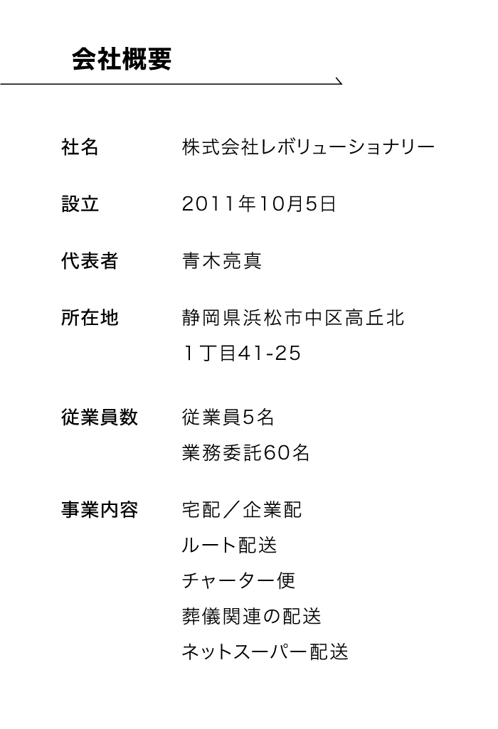 社名の由来は、Revolutionary=革命児。新時代の流れの中で、古い概念に固執することなく、常に新しい考え方をサービスに取り入れ、成長し続ける企業でありたいと考えております。