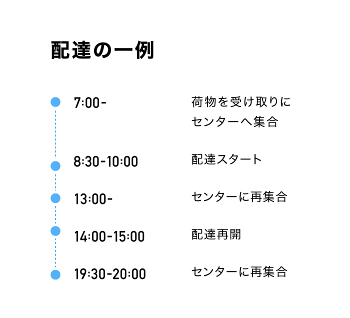 このくらいは稼ぎたい、このくらいなら働ける、当社では自分が頑張りたい分だけ、お給料にも反映されます。入社して数ヶ月もすると、誰でも理想的な配達量を1日にこなせるようになります。一緒に理想的な働き方や必要な収入を目指してみましょう。