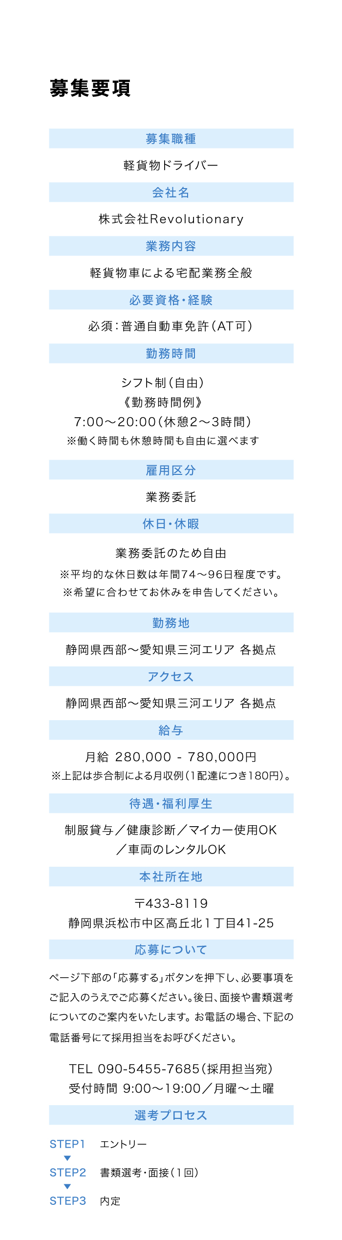 当社は軽貨物ドライバーのお仕事が中心。届けるのは、個人宅や企業向けの封筒や小さな荷物ばかりで、特別なスキルは必要ありません。ひとつひとつの荷物やその思いを大切に扱い、あなたの笑顔と一緒にお届けする。それが私たちレボリューショナリーのお仕事です。